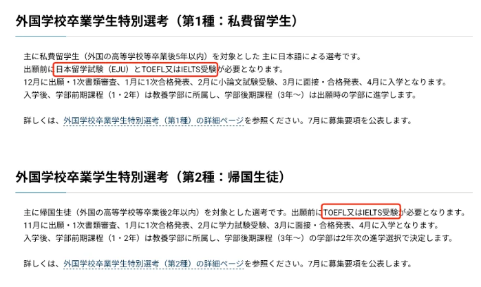 日本大学、驹泽大学等私立大学,仅要求提供EJU日语成绩或JLPT日语能力考试成绩,而英语成绩的要求较少。