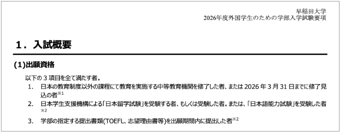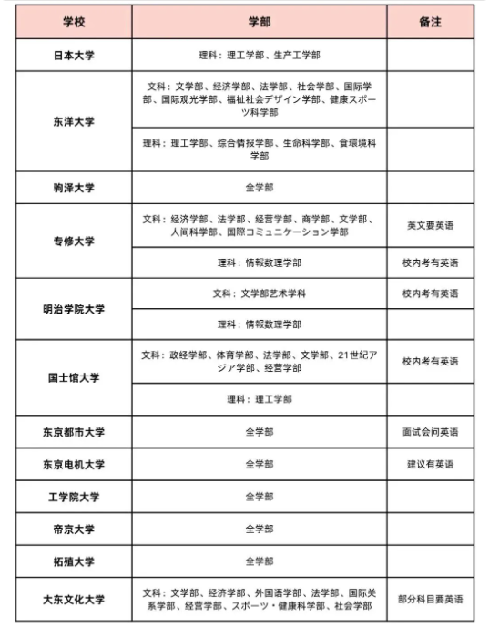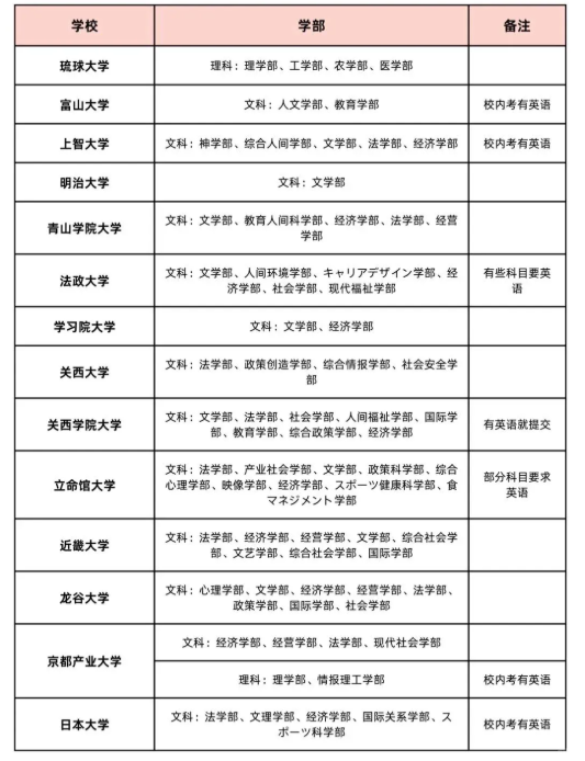 在一些私立大学学部(本科)中,申请条件通常侧重于日语能力,而英语成绩的要求较低。例如: