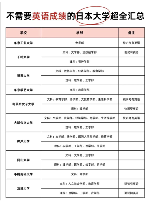 此外,专门学校(如日本的技术类学校或职业学校)通常也不要求英语成绩,重点考察的是日语能力(一般为N2或以上)。
