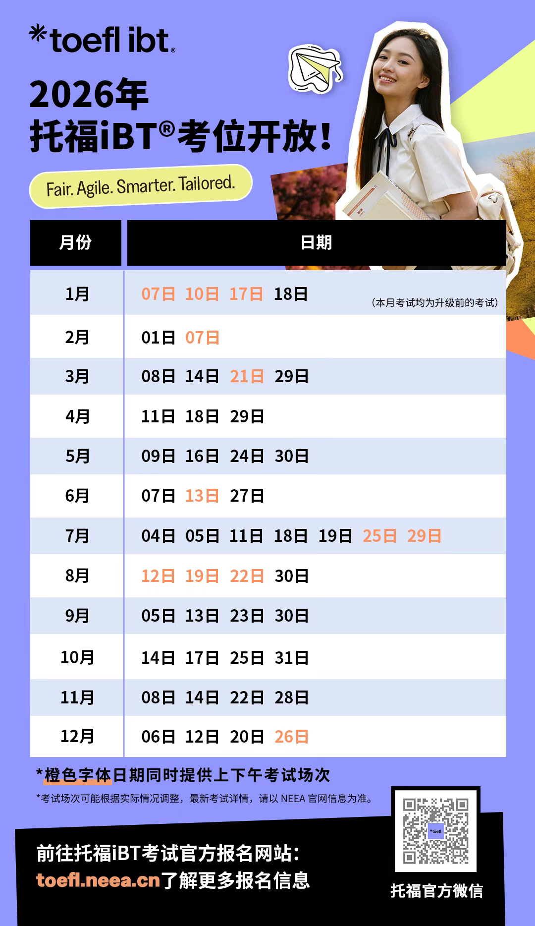 另外,要注意:根据美国教育考试服务中心(ETS)2025 年 5 月 29 日发布的官方公告,托福 iBT® 考试从2026 年 1 月起在考试结构智能升级、评分体系双轨制改革、考试内容全球化更新等方面实施系统性革新。